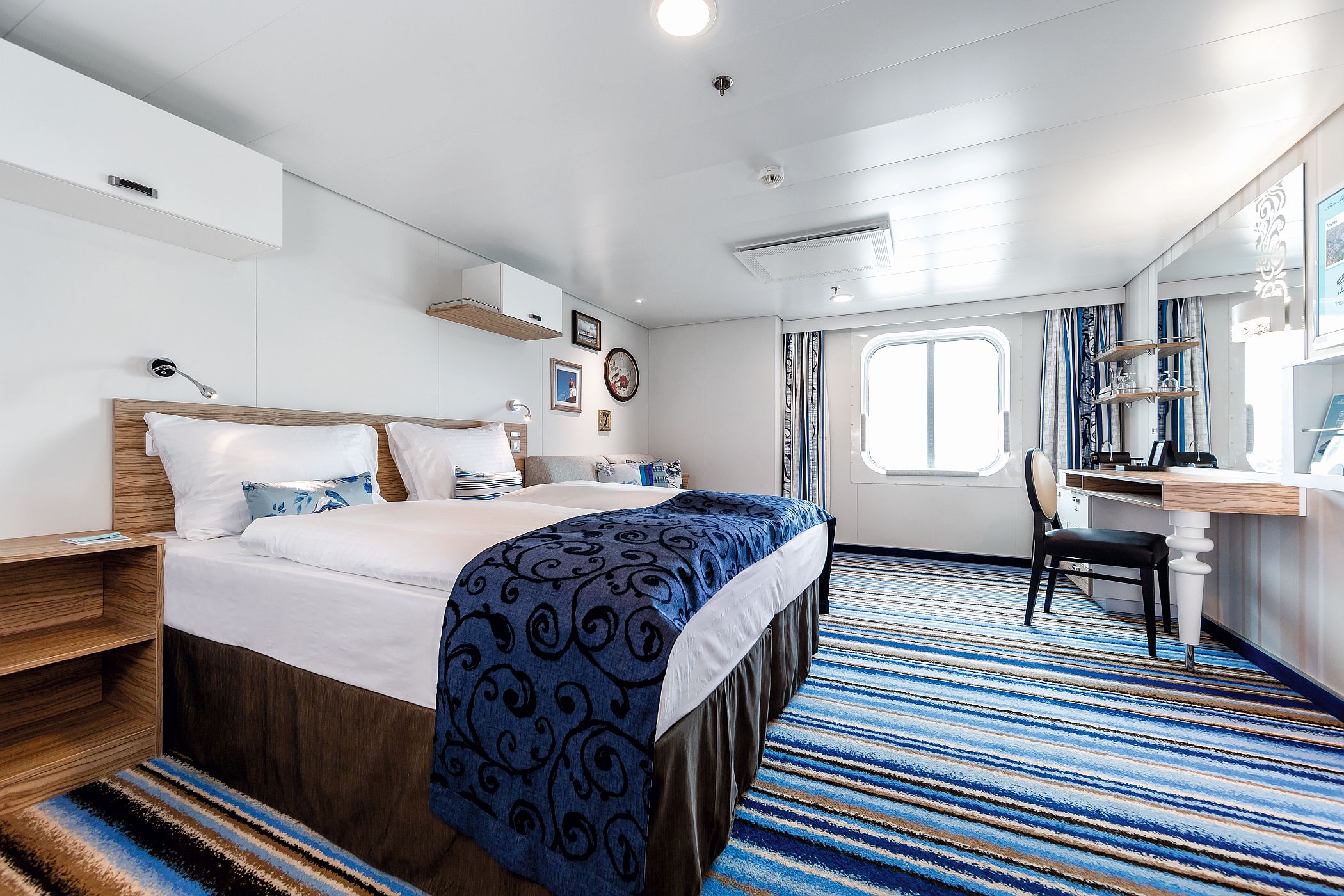 Kabiny na Mein Schiff 4 to przestrzeń, komfort i elegancki minimalizm. Wnętrza utrzymano w jasnych barwach, z drewnianymi detalami i dużą ilością światła dziennego. Wszystkie wyposażone są w telewizor, sejf, minibar, klimatyzację, suszarkę do włosów oraz zestaw do kawy i herbaty.