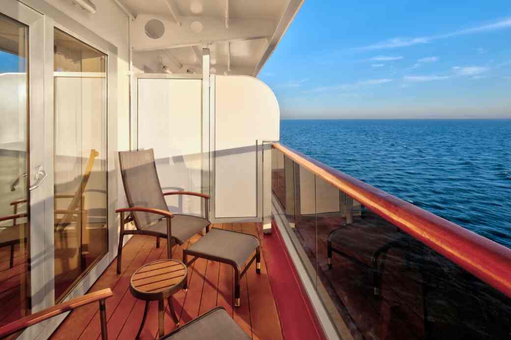 2 dolne łóżka zamienne na 1 łóżkiem typu queen-size, łazienka z wanną i prysznicem, komfortowe łóżka wyposażone są w wygodne materace i pościel drobno tkanej bawełny. Szlafroki frotte do użytku podczas podróży, 100% egipskie bawełniane ręczniki oraz natryski masujące. W łazience znajdziemy pachnące mydła, balsamy, szampony i inne kosmetyki do kąpieli z Elemis Aromapure. W kabinie znajduje się sejf oraz telewizor z płaskim ekranem i odtwarzaczem DVD . Dodatkowo w kabinie znajdują się panoramiczne okna sięgające na wysokość całej kabiny. Dodatkowo pasażerom tej kabiny oferowane są bezpłatne usługi pralni chemicznej, bezpłatne wino musujące serwowane w salonie Neptuna, lornetki i parasole do korzystania podczas rejsu,dostęp do Neptune Lounge. Pasażerom tej kabiny przysługuje zaproszenie na cocktail party z oficerami,