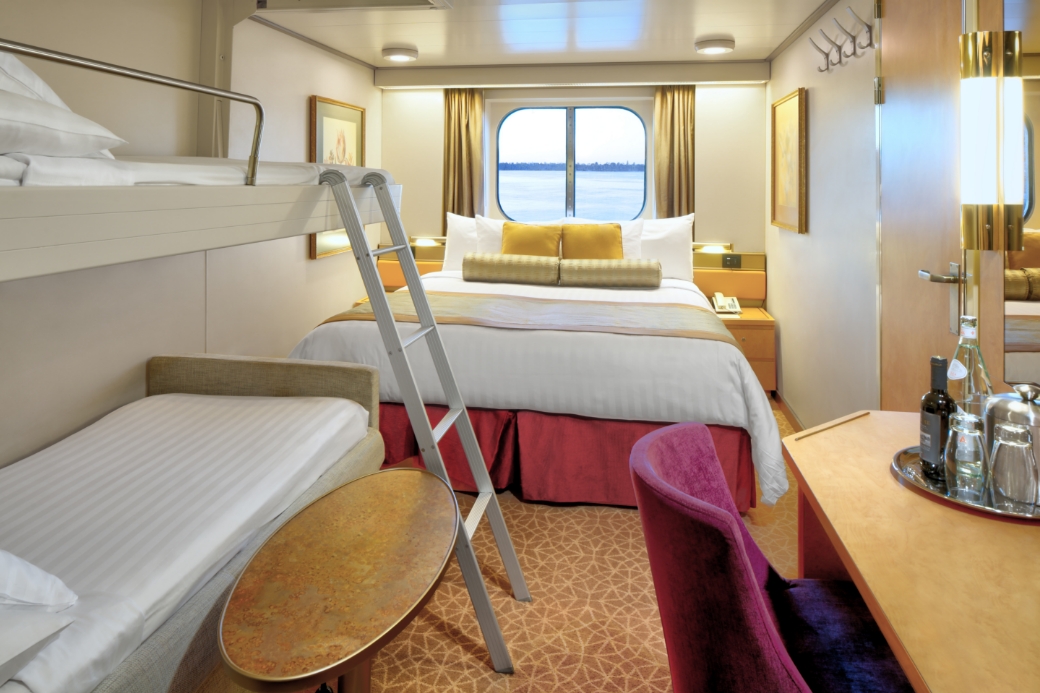 2 dolne łóżka zamienne na 1 łóżkiem typu queen-size, łazienka z wanną i prysznicem, komfortowe łóżka wyposażone są w wygodne materace i pościel drobno tkanej bawełny. Szlafroki frotte do użytku podczas podróży, 100% egipskie bawełniane ręczniki oraz natryski masujące. W łazience znajdziemy pachnące mydła, balsamy, szampony i inne kosmetyki do kąpieli z Elemis Aromapure. W kabinie znajduje się sejf oraz telewizor z płaskim ekranem i odtwarzaczem DVD . Dodatkowo w kabinie znajdują się panoramiczne okna sięgające na wysokość całej kabiny.